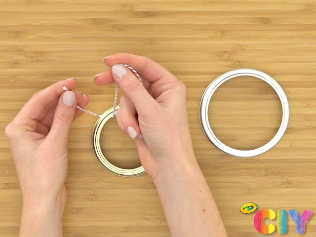 Loop string through mason jar lids, then tie to create the ornament hangers.