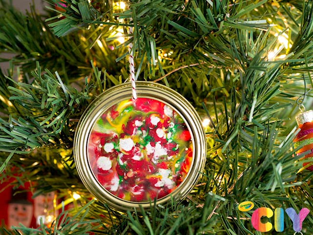 Create melted crayon art in the form of DIY ornaments. Melted crayon shavings and a few other supplies turn mason jar lids into homemade holiday decorations!