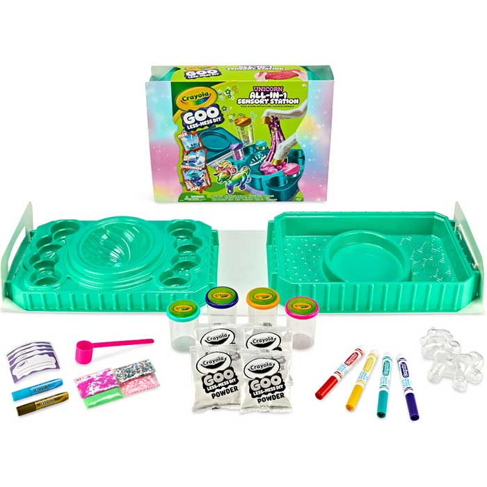 • Explore magical sensory play with the Crayola Unicorn All-In-1 Sensory Station! This mess-free kit includes 1 slime station, 4 goo powders, 4 mix-ins, 2 glitter glues, 1 unicorn display, 4 mini goo cups, and 1 scoop. Kids can mix, stretch, and customize slime for a fun, tactile experience that sparks creativity and supports sensory development. This endless slime-tastic fun encourages creativity and allows children to express themselves through their unique slime creations.